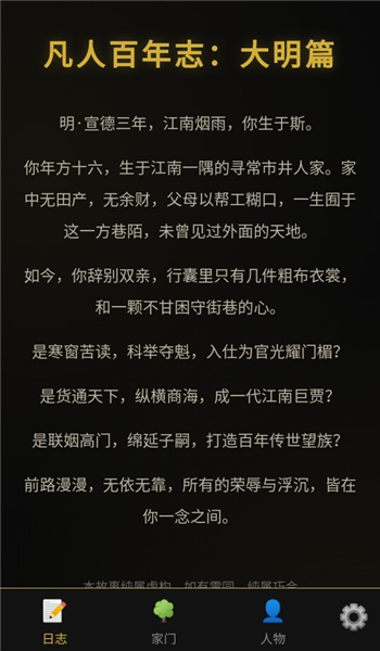 凡人百年志:大明篇无限财富版是一款模拟养成剧情文字游戏,主要以精美细腻的水墨画风格打造与文字叙述的方式为玩家带来真实的明朝时代,玩家扮演江南寒门少年,从零开启自由选择科举仕途、经商致富、家族传承不同的行业与未来进行发展与逆袭,开创全新的结局,感兴趣的玩家不要错过哦!
