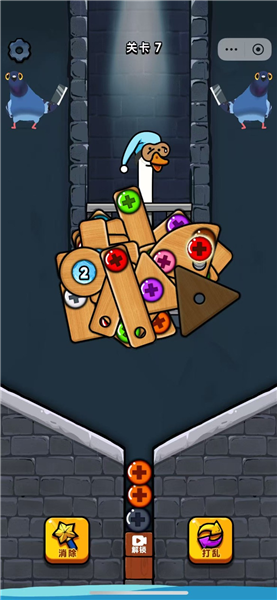 4、不断消除更多相同颜色的螺丝来移开木板,清除所有木板拯救小鸭子。
