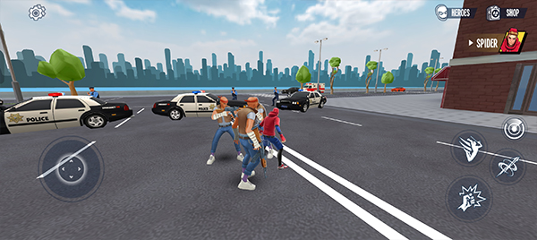 2、游戏的玩法很简单,只需在有限的生命值内击败游戏中的所有歹徒,左侧控制角色的方向,而右侧则是各种技能键;