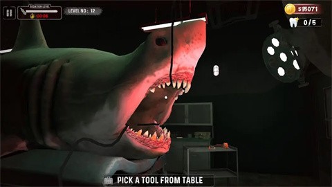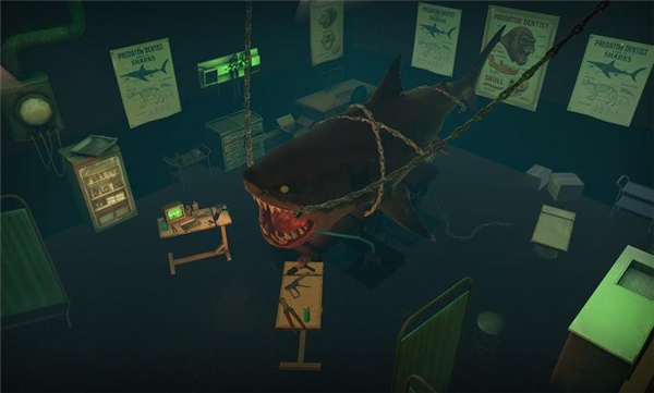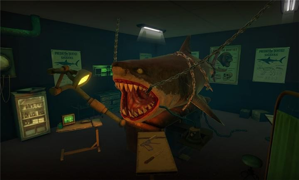 1、极限高压操作体验:场景设定在昏暗压抑的地下诊所,鲨鱼被悬挂于天花板,在其巨大的口腔附近开展精细操作。每一次工具选择、每一次操作幅度,都直接决定生死,任何微小失误(如器械滑落、操作过急)都可能导致鲨鱼苏醒,被其瞬间吞噬,沉浸式感受极限高压的游戏氛围。