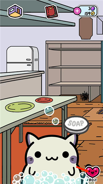 6、点击【洗澡】选项,拖动香皂在猫咪上,可看到右下角情绪值为80%。