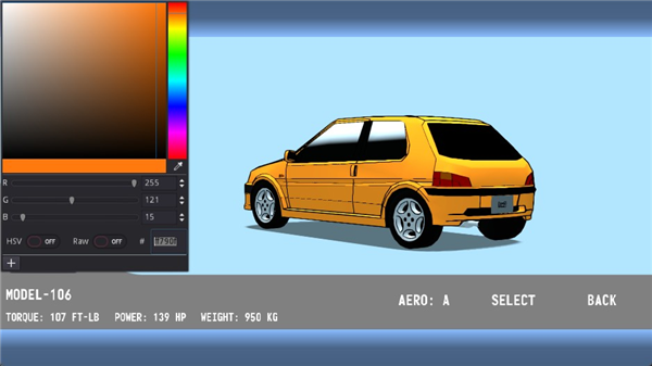 3、进入车辆选择页面后,你可以自由切换车型并修改车辆颜色,打造属于你的赛车风格。
