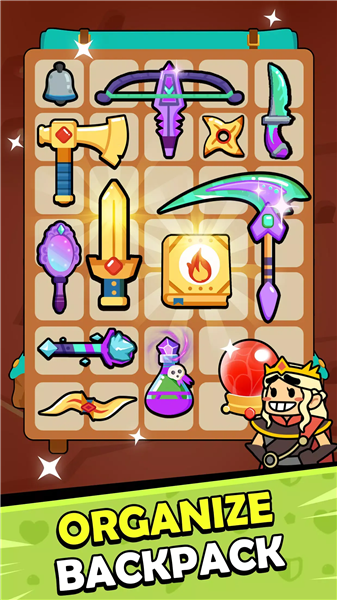 背包狂潮是一款竖版冒险游戏。每个人可以获得一个随身包裹,将收集到的兵器放入这个包裹当中,借此获取对应武器的战斗能力。从第一件武器入手开始,背包方格如同棋盘,刀剑、弓箭、法杖各占不同格子形状。同类型武器相邻摆放产生额外加成,例如三把匕首连成一线则攻击速度提升。怪物掉落随机属性武器,金色传说级通常体积更大。赶快下载游玩吧!