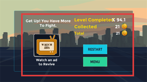 4、关卡结算界面能看到【Level-Completed-94点1】,可选择【WATCH-ADS-to-Revive】复活或点击【MENU】返回主界面。