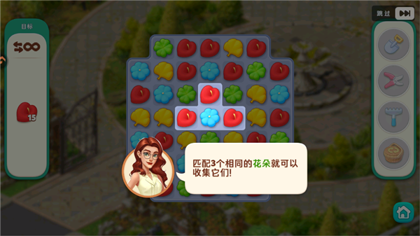 游戏的核心玩法是传统的三消模式,玩家需要通过消除相同的花朵来收集庄园建造所需的资源。消除的花朵数量越多,获得的资源也就越丰富,助力更快打造梦想家园。