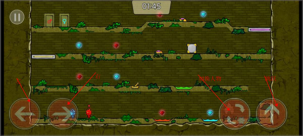 3、基本操作如下图,你需要控制好游戏中的两个角色,配合起来解决所有难题。收集所有的宝石,到达大门即可获取胜利。