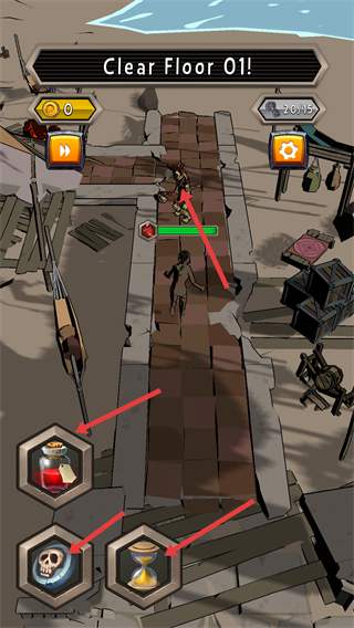 4、进入地牢,需要对战敌人,操控角色移动,还能使用药水、骷髅头等道具,助力完成清理敌人任务。