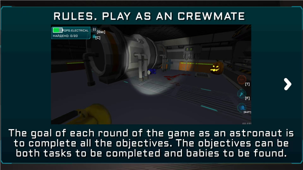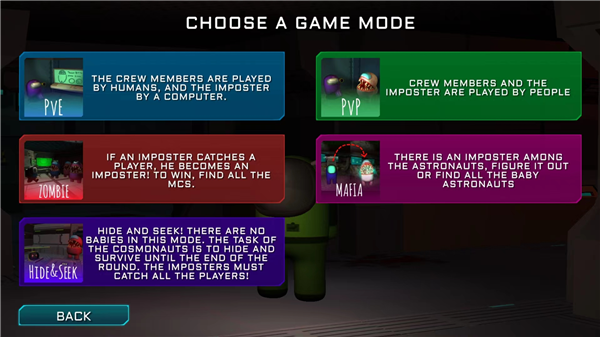 在线多人竞技模式,玩家分为两大阵营,太空人阵营对抗冒名顶替者阵营,玩家可选择扮演冒名顶替者,与其他玩家实时对战、斗智斗勇。