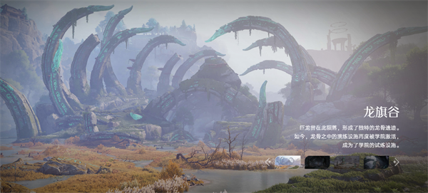 上古巨龙陨落形成的龙骨遗迹遍布峡谷,巨型骸骨带着幽绿符文,荒草与浅溪点缀其间,充满蛮荒力量感。