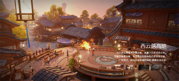 以霜云镇为核心的中式古镇,木构建筑鳞次栉比,灯笼暖光与广场篝火相映,充满市井烟火气。