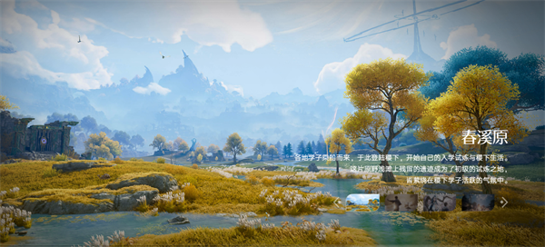 澄澈溪流蜿蜒于金黄草甸,上古遗迹石碑散落其间,远处山峦叠翠,飞鸟掠过天际,是充满生机的新手试炼场。