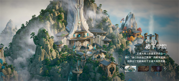 依山而建的稷下学院,以高耸入云的通天塔为视觉中心,云雾缭绕的山石间错落着飞檐翘角的中式楼阁,墙面云纹与流光机关交织,尽显 “自己告诉自己真理” 的治学气度。