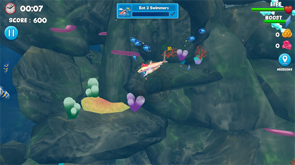 3、超大开放式游戏地图,操控鲨鱼穿梭多样海域风景,自由探索捕食。