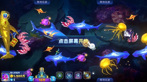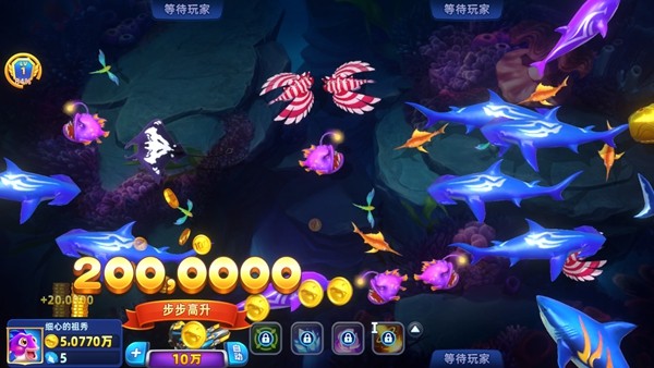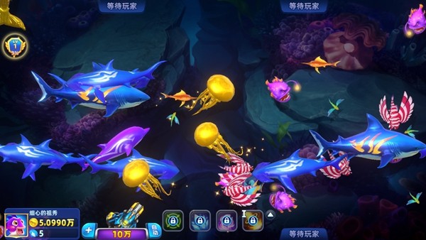 4、多级炮台自由切换,核弹全屏秒杀大招强势来袭,大范围收割海底鱼群。