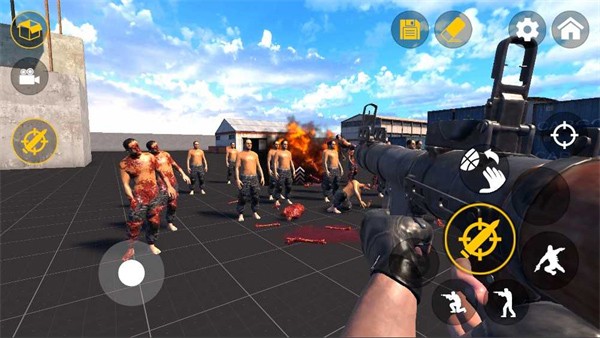 2、通过屏幕上的虚拟按键来控制人物的移动、跳跃、蹲下以及射击等基本动作;
