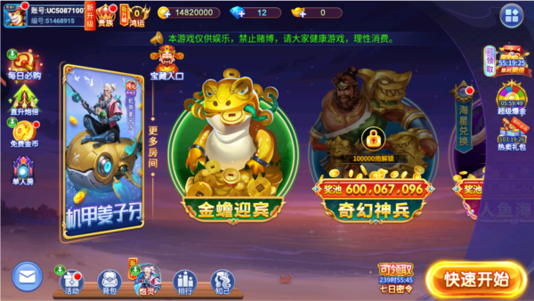 4、如果说长时间停留在房间里的话,你们超过5分钟没有捕鱼是会被踢出去的,所以你们自己可以动一动。