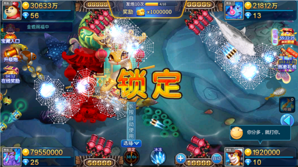 3、使用弹头打BOSS鱼可以一击必中,青铜弹头可以获得27万左右金币、黄金弹头110万左右金币、核弹头225万左右金币。打死美人鱼有一定机率掉落弹头,打死宝藏船必掉落弹头。