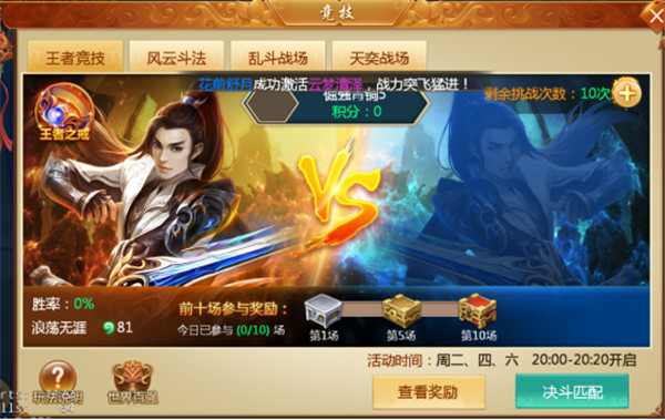 1、角色达到巅峰1级可以参与王者竞技,每周二、四、六晚上8点开启;