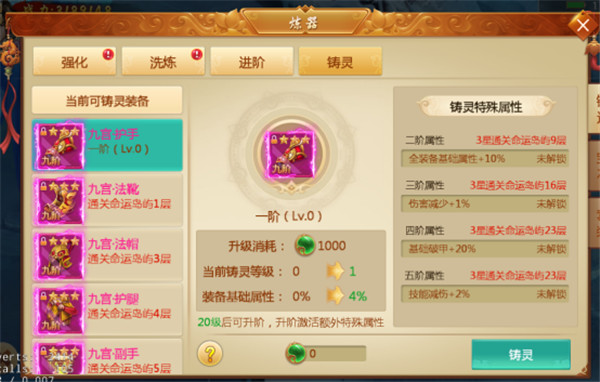 3、铸灵可提升装备属性,到达一定阶数还可激活装备的特殊属性(灵值可通过挑战副本-命运岛屿获得)。