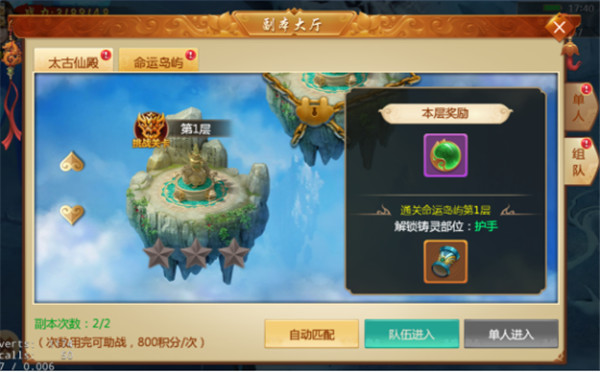1、角色达到巅峰50级可开启副本-命运岛屿,副本可最多三人组队进入;