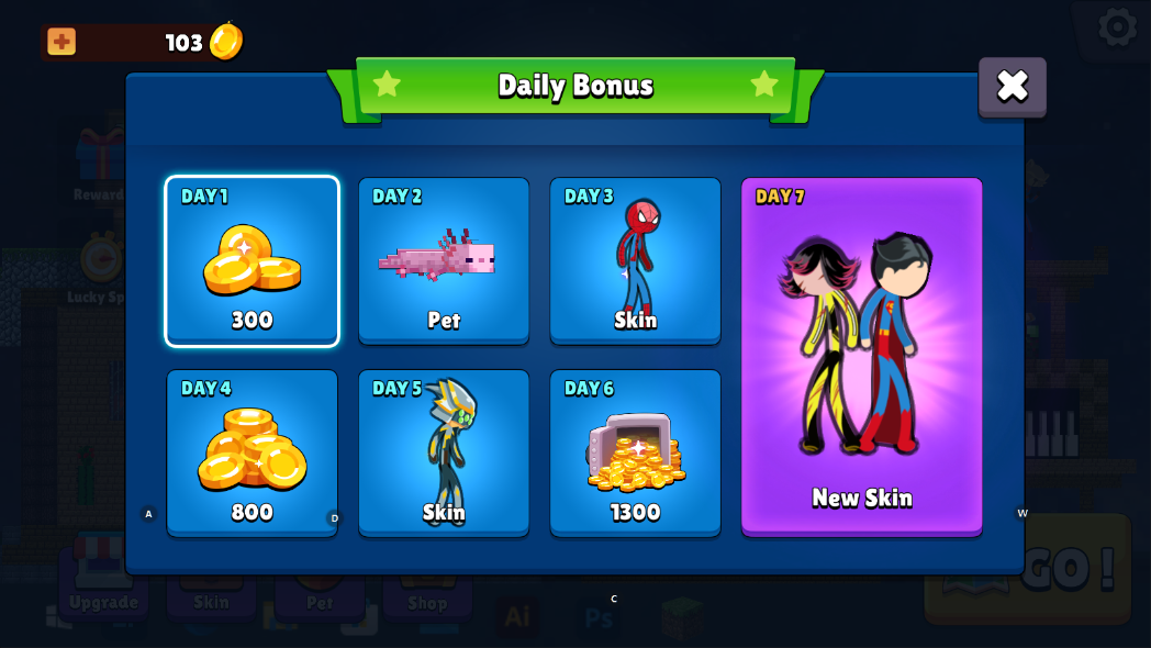 2、点击左侧-rewards,每日奖金,连续登入一周,即可获得新皮肤