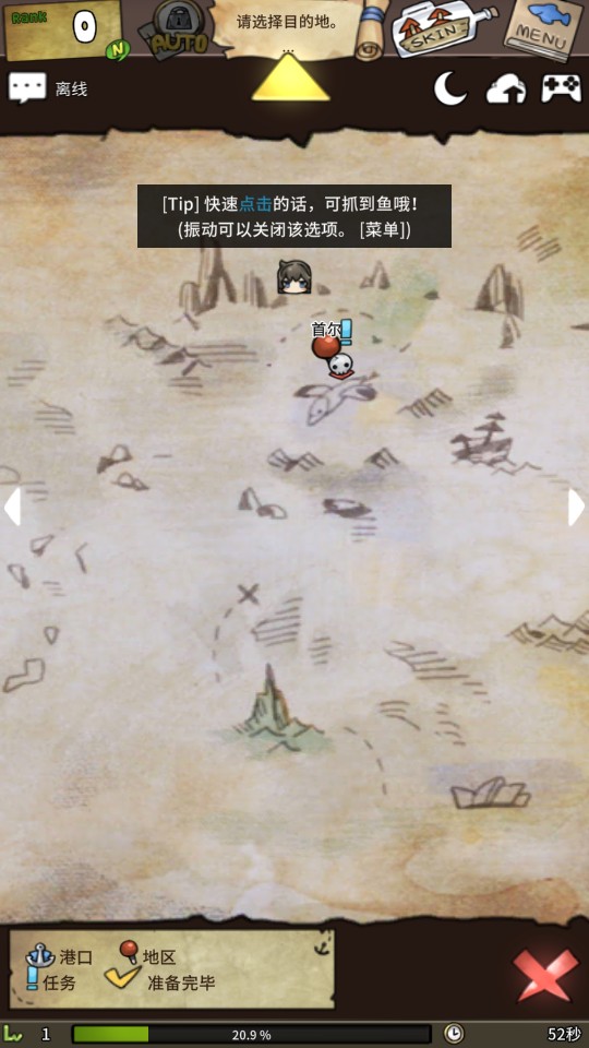 4、游戏上方可以点击打开地图,前往不同的地方钓鱼,或者其他特殊地方,比如前往港口出售和购买物品,交易需要珍珠,而装备能提供属性加成。