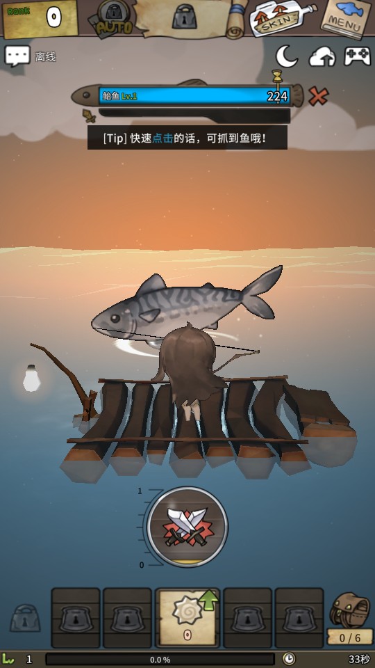 2、点击感叹号之后鱼上钩,玩家需要在有限时间内快速点击攻击键清空鱼的血量从而钓上鱼,获得奖励。