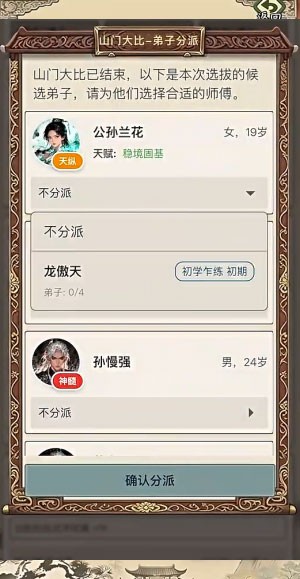 2、弟子培养:根据资质分配师傅与岗位,安排修炼或外出历练提升属性与技能等级。