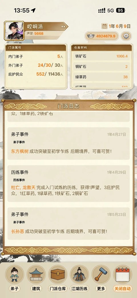 4、派遣弟子外出历练,并采集各类珍稀草药以壮大宗门资源。