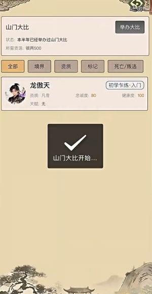 1、玩家可在宗门内组织各类大比,全面检验弟子的天赋与潜力。