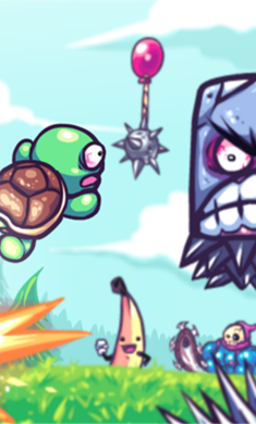 3、卡通诙谐的画风与音效,采用色彩鲜明的卡通风格,角色表情夸张(如乌龟被发射时的呆萌歪头),场景设计充满奇幻元素。
