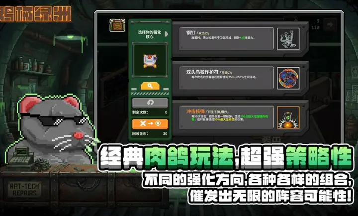 鸡械绿洲手游是一款结合塔防、Roguelike和俯视角射击元素的复合型策略游戏,:地图、敌人、事件均为随机生成,玩家需布置六类鸡械设施(炮台、守卫、陷阱、战士、巢穴、特殊)保护基地车抵达终点,防御塔的摆放位置和类型选择直接影响战局。通过开采矿石、击破障碍、完成事件获取动力(资源),复古像素风格搭配电子摇滚配乐,鸡械名称充满谐音梗,营造轻松诙谐的氛围。