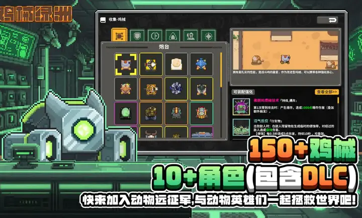 3、复古像素美学与魔性氛围,:采用低多边形像素画风,角色与鸡械设计充满谐音梗,场景细节增强沉浸感。