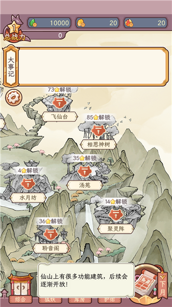 3、分为仙界和人界两个区域,随着等级以及剧情的推进可以解锁各个区域更多的功能;