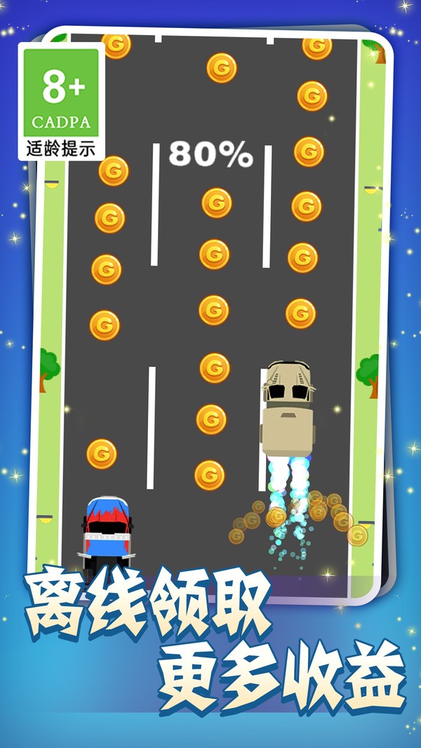 3.不仅可以通过闯关获取金币赚钱,每一辆车都可以带来收益,离线挂机也能获得收益。