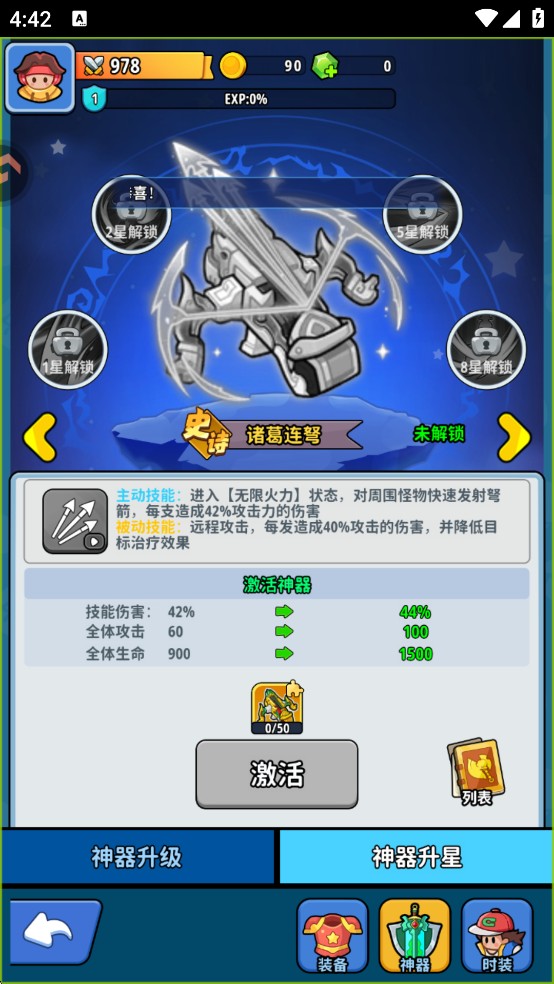 主动技能:进入【无限火力】状态,对周围怪物快速发射弩箭,每支造成42%攻击力的伤害