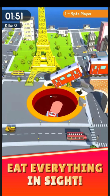 化身黑洞,尽情吞噬城市中的建筑、车辆与各类物体,在崩解与吸收的过程中释放压力,体验破坏与重组带来的独特快感。