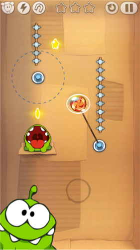 5、线圈,当糖果进入线圈内部时,会与线圈圆心用绳索固定,但只能用一次,糖果进入之后虚线圈则会消失,再次进入就不会起作用了。