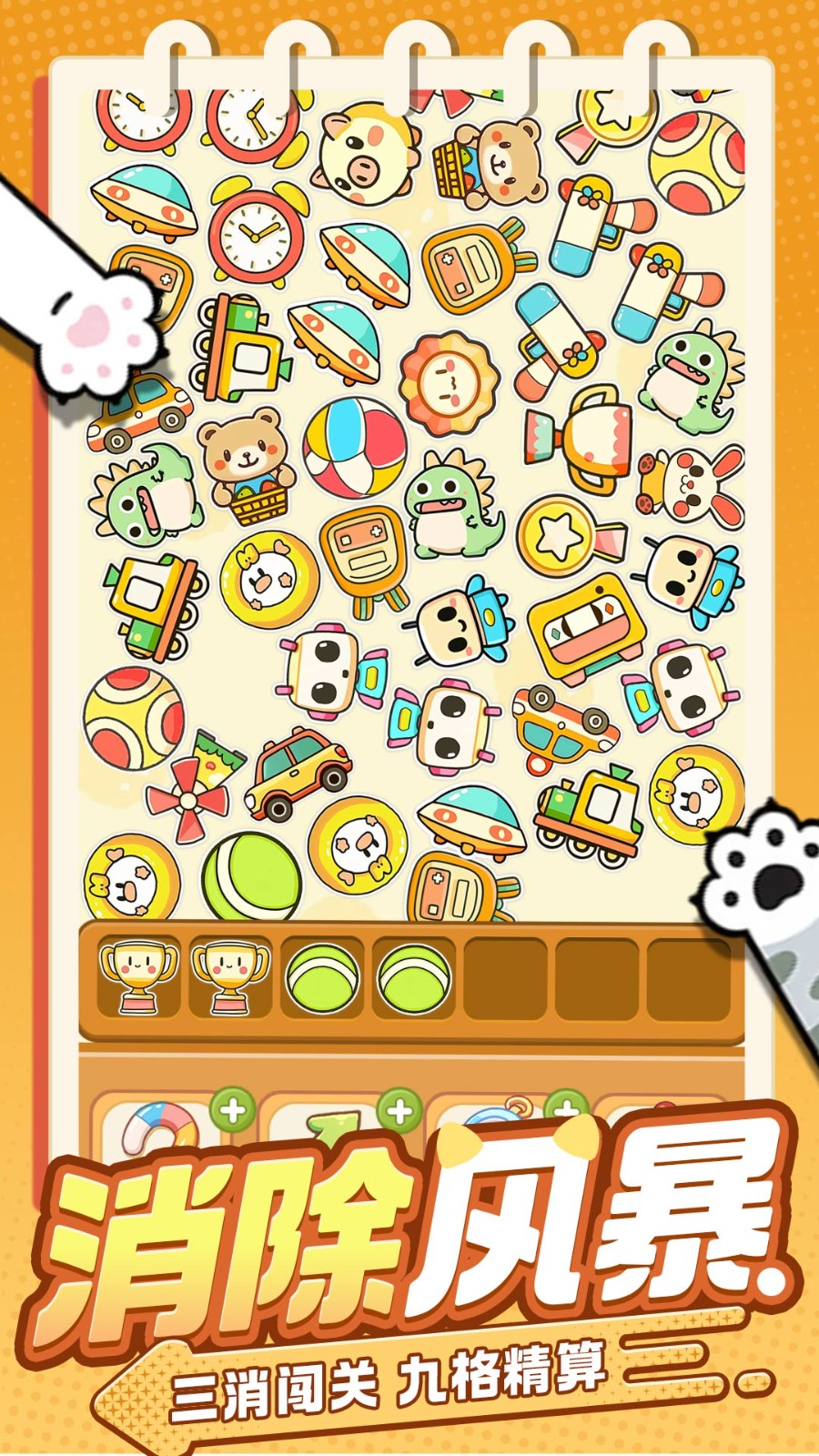 3.点击屏幕中的贴纸,被点击的贴纸将会存放到下方格子区域,凑齐三个即可消除。注意,一旦格子被占满无法消除那么挑战就会失败。