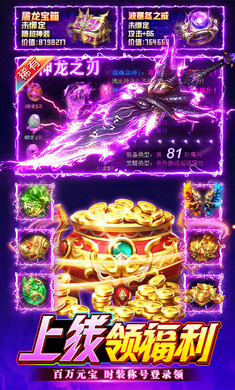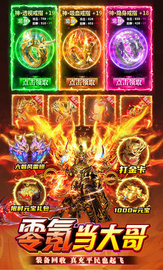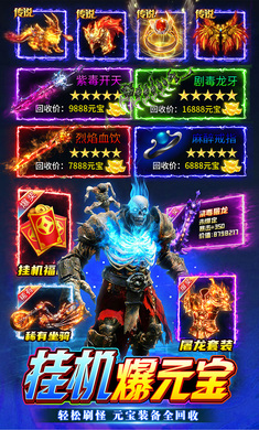 3、极速攻速与高爆率,上线即享满级攻速,一秒五刀、刀刀暴击,小怪也能爆永恒装备,装备回收系统支持一键售卖,轻松打金。