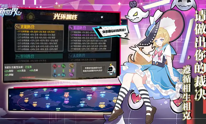 2、角色养成与策略战斗,角色分属六大阵营,阵营间相生相克,需根据敌人特性灵活搭配阵容。