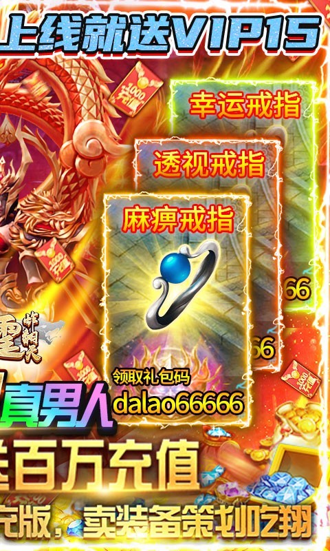 雷霆炸翻天是一款全新超变版本的传奇类动作游戏。玩家上线输入礼包码就送VIP15、炫酷时装、绝版称号、神级宠物、麻痹戒指、复活戒指。连续登录即可领取海量真充卡,每日签到免费领真充免费领。无限刷充无门槛使用,无限充值豪礼免费领。