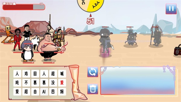 3、正式开始后点击左边的汉字就可以进行拼凑,当右边的方块里拼出不同的梗词时就可以召唤角色。