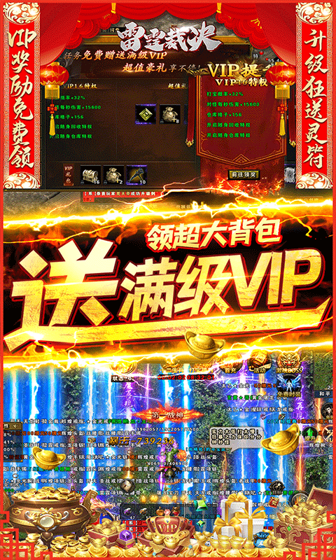 【雷霆裁决】上线送满级VIP、500万绑定元宝、2W灵符、弑神令*1000、极品弑神令*1000、限时体验时装。送青莲地心火,特色异火系统,升级异火全方位提升属性。VIP奖励免费领,领取一百多格超大背包。等级福利升级领灵符,可在灵符商城里兑换时装和称号。超高爆率时装免费,击杀时装BOSS可掉落极品时装。