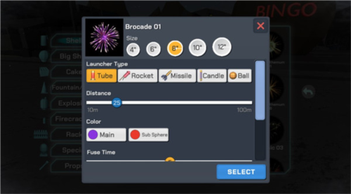 8、我们选择一个并点击,就会弹出这样一个界面,在这里可以选择烟花的大小、发射器的类型、烟花发射的距离、烟花引线燃烧的时间等等,
