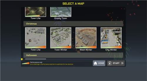 3、进入模式后,这里我们可以上下滑动,选择不同的地图去放烟花,选择好后点击start即可进入,