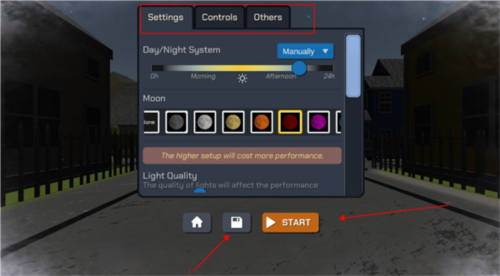 4、进入后会弹出一个设置,我们可以在此设置月亮颜色、地图日间夜间的时间、控制的灵敏度、还有烟花发射保障产生的振动等等,当我们设置好后,还可以点击下面的存储按键,保存下来,这样后面就不同再次手动调整了,