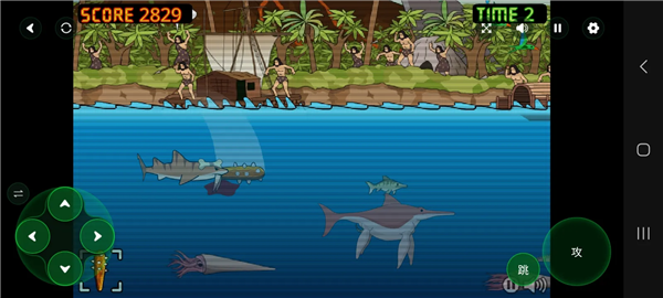 1、可借助虚拟摇杆搭配功能按键,灵活操控鲨鱼完成移动、主动攻击,释放强力特殊技能等一系列核心操作。