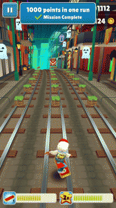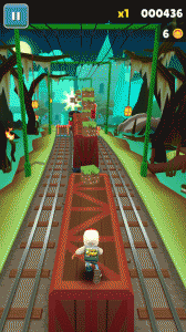 玩家经常遇到的一种情况。左右两路没有任何障碍,中路有3~4辆火车飞驰而过。为了把车上的游戏币吸收干净,这个时候就可以运用基础组合跳滚了,前提是要注意节奏感,不能太快,如果火车还没到达你的脚下,你就已经在半空中往下划,那么就只有被撞了。如果玩家持有磁铁的话,建议普通跳跃就可以,磁铁会把漏掉的所有游戏币自动吸附给玩家。