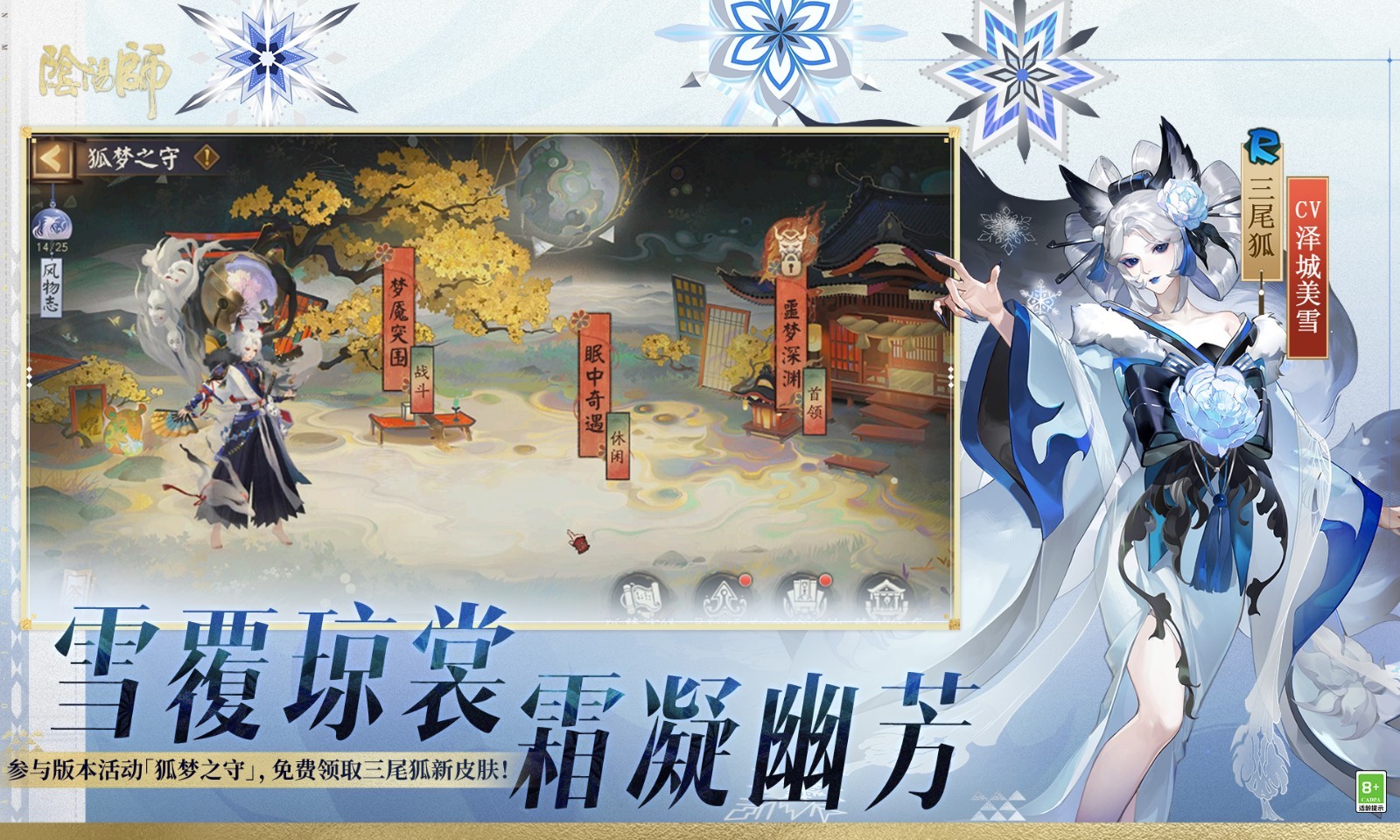 ● 大型活动:「梦山新话」12月17日维护后开启,参与活动可免费获取三尾狐新皮肤「霜映琼雪」!